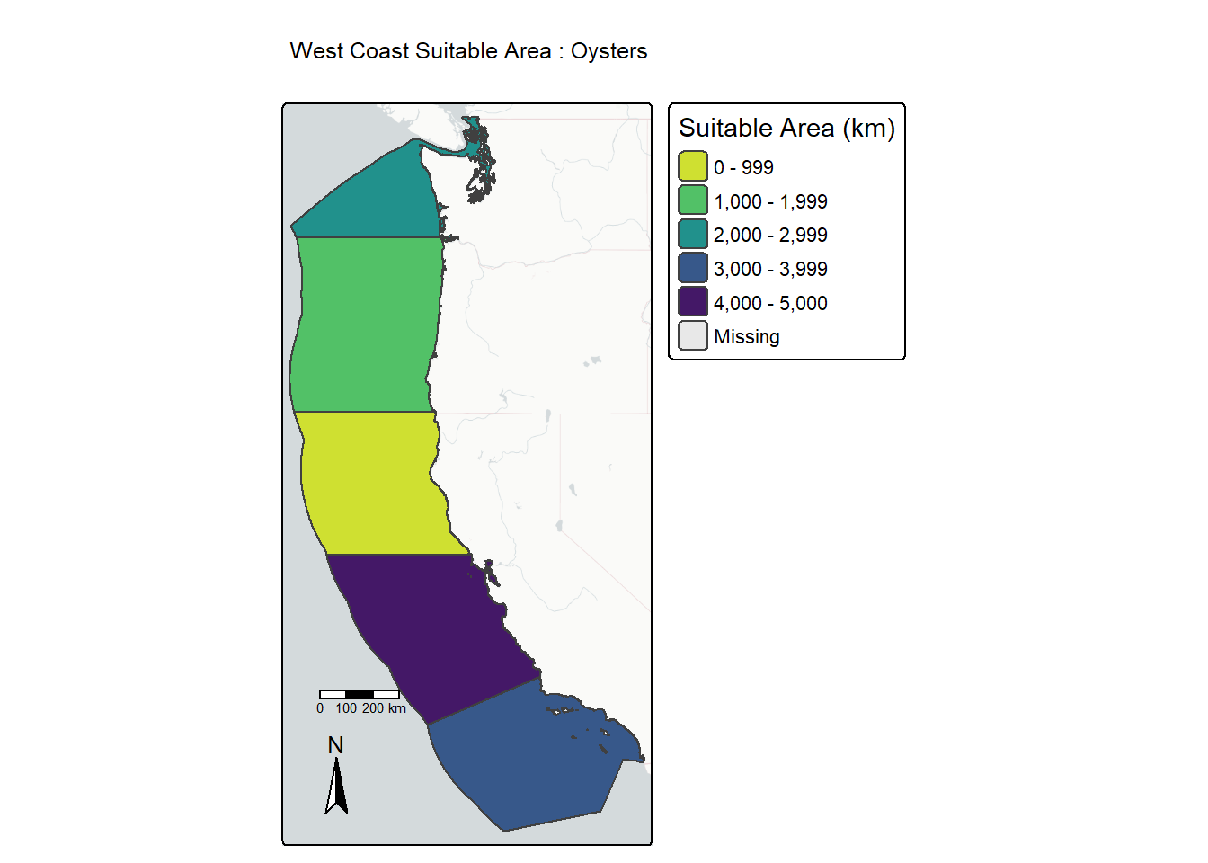 In our map, we can see the 5 EEZ areas split along the west coast of the United States, and the EEZ with the largest area of suitable habitat is in the central coast of California, following by the southern coast of California. If we, for example, want to maximize our potential for oyster aquaculture on the west coast of the United States, these areas may be the most ideal in terms of habitat suitability for oysters.