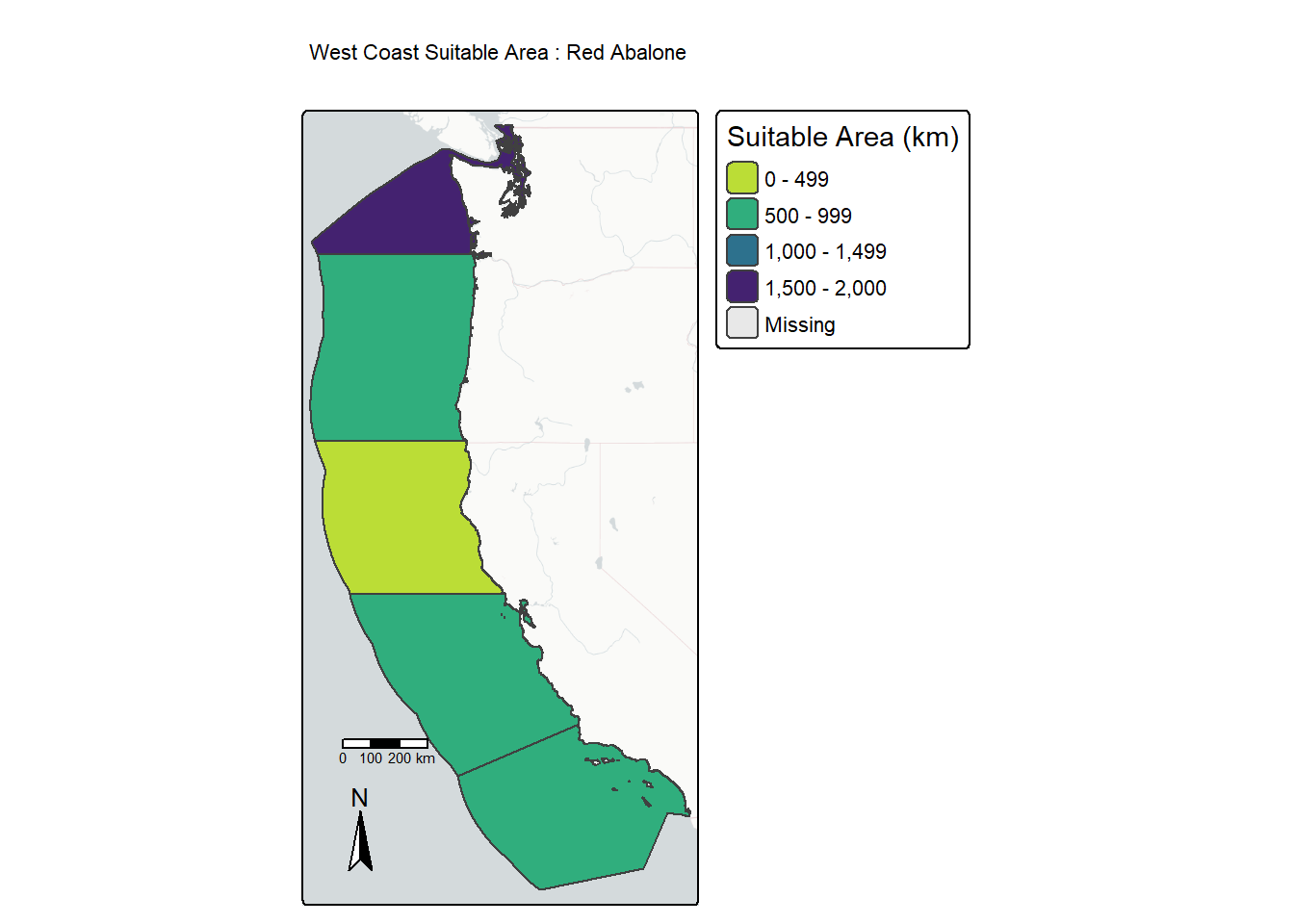 Native oysters, Olympia oysters for example, have a range that spreads all along the west coast. Their suitable EEZ areas make sense, with most of the area very close to shore where temperature and depth satisfies their ecological needs. Red abalone are also found along the entirety of the west coast, however with smaller suitable temperature and depth ranges, it makes sense they have a much smaller area of suitability.